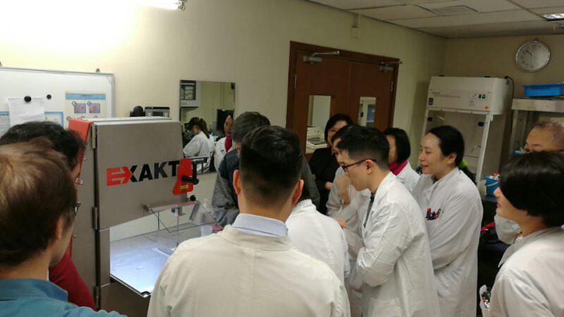 ? ? ?2017年2月13日,EXAKT北京共贏聯(lián)盟國(guó)際科技有限公司的技術(shù)團(tuán)隊(duì)來(lái)到香港伊麗莎伯醫(yī)院對(duì)EXAKT312金剛石骨組織病理帶鋸進(jìn)行安裝和培訓(xùn),參與學(xué)習(xí)的老師和專(zhuān)家對(duì)其簡(jiǎn)單的操作和高精度的切割工藝贊嘆不已,并紛紛上手實(shí)際操作。2月23日在重慶的新橋醫(yī)院另一臺(tái)EXAKT312金剛石骨組織病理帶鋸也成功安裝并培訓(xùn)。
