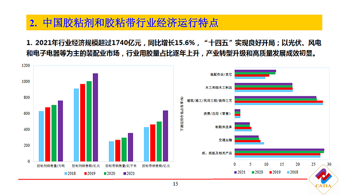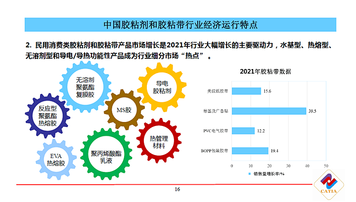 中國(guó)膠粘劑和膠粘帶工業(yè)協(xié)會(huì)秘書長(zhǎng)楊栩介紹了中國(guó)膠粘劑和膠粘帶行業(yè)的市場(chǎng)現(xiàn)狀,發(fā)布了行業(yè)各品種的最新統(tǒng)計(jì)數(shù)據(jù),系統(tǒng)梳理了膠粘劑和膠粘帶相關(guān)政策和環(huán)境變化,并分享了2021年以來(lái)行業(yè)經(jīng)濟(jì)運(yùn)行的十大特點(diǎn),以及行業(yè)未來(lái)的八大展望。