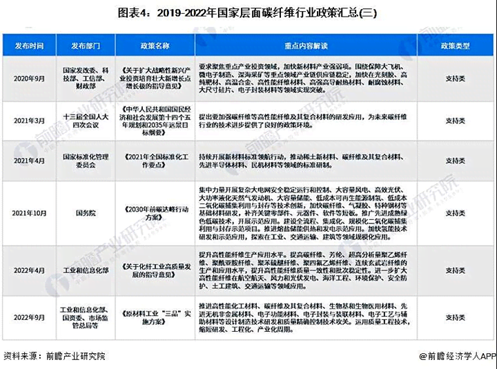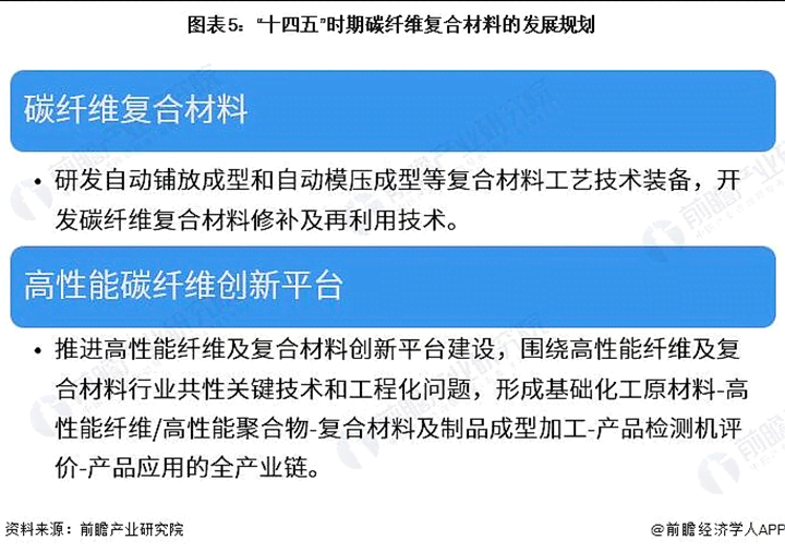 根據(jù)《化纖工業(yè)高質(zhì)量發(fā)展的指導意見》,“十四五”時期,提高碳纖維、芳綸、超高分子量聚乙烯纖維、聚酰亞胺纖維、聚苯硫醚纖維、聚四氟乙烯纖維、連續(xù)玄武巖纖維的生產(chǎn)與應用水平,提升高性能纖維質(zhì)量一致性和批次穩(wěn)定性。進一步擴大高性能纖維在航空航天、風力和光伏發(fā)電、海洋工程、環(huán)境保護、安全防護、土工建筑、交通運輸?shù)阮I(lǐng)域應用。具體碳纖維復合材料行業(yè)規(guī)劃圍繞碳纖維復合材料以及高性能纖維創(chuàng)新平臺展開。